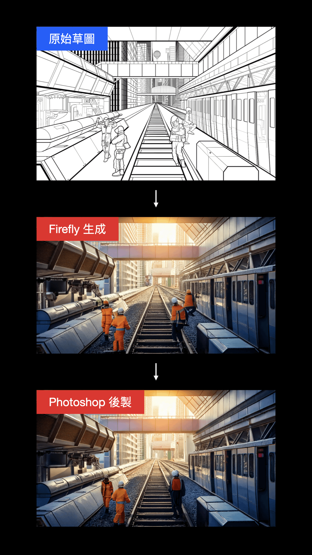 - 聚焦在 AI 生成後的銜接流程,示範 Adobe Photoshop 的基礎必備操作