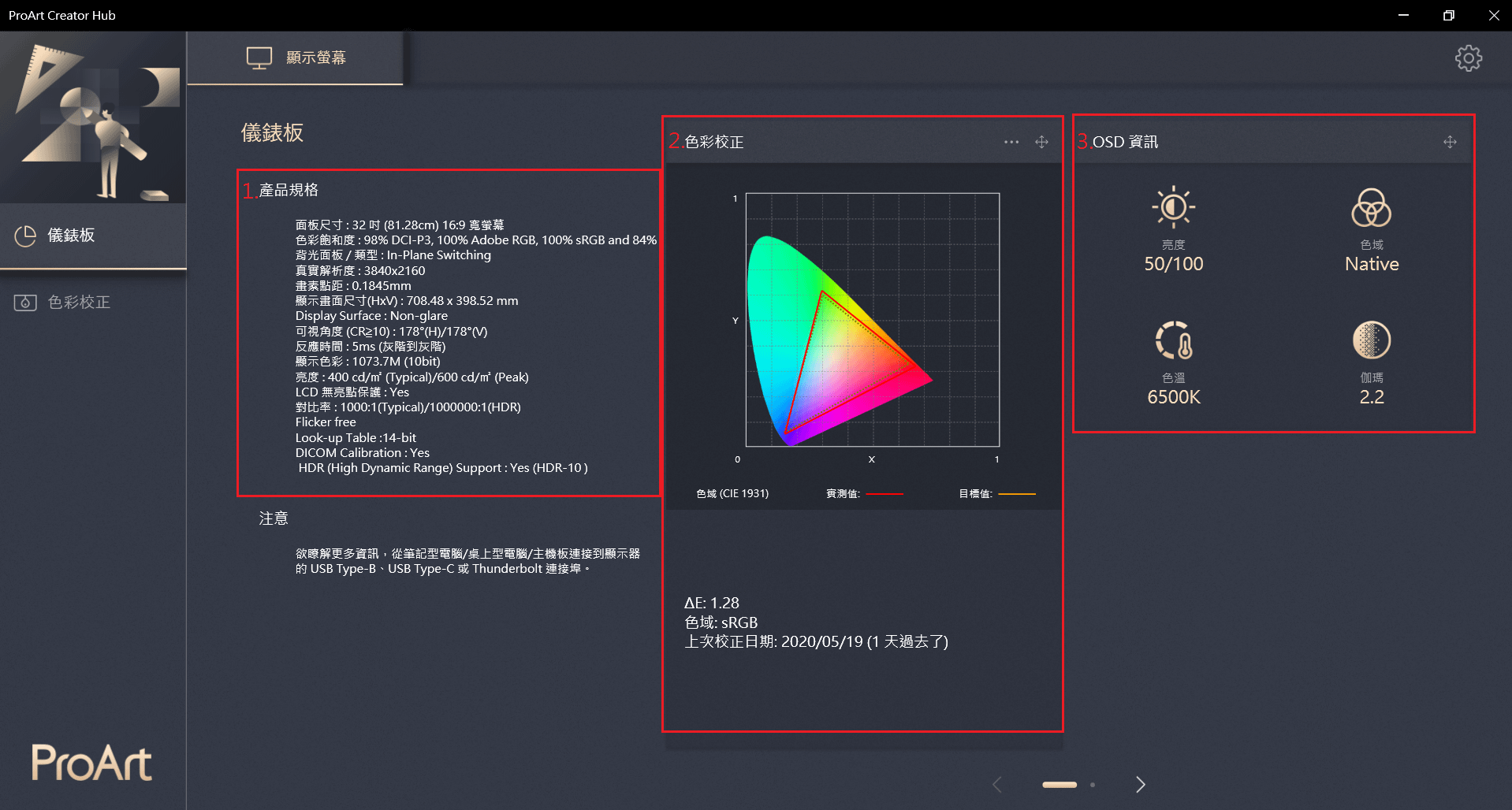 華碩 ASUS ProArt 系列顯示器:華碩的 ProArt 系列定位於內容創作者顯示器,強調出廠即提供高色彩精確度和硬體校色支援。ProArt 多款型號(如 PA32UCX、PA279CV 等)具備硬體 LUT 校色功能,用戶可透過 ProArt Creator Hub 軟體搭配 X-Rite 校色器來校準並將色彩參數寫入螢幕內部的 3D LUT