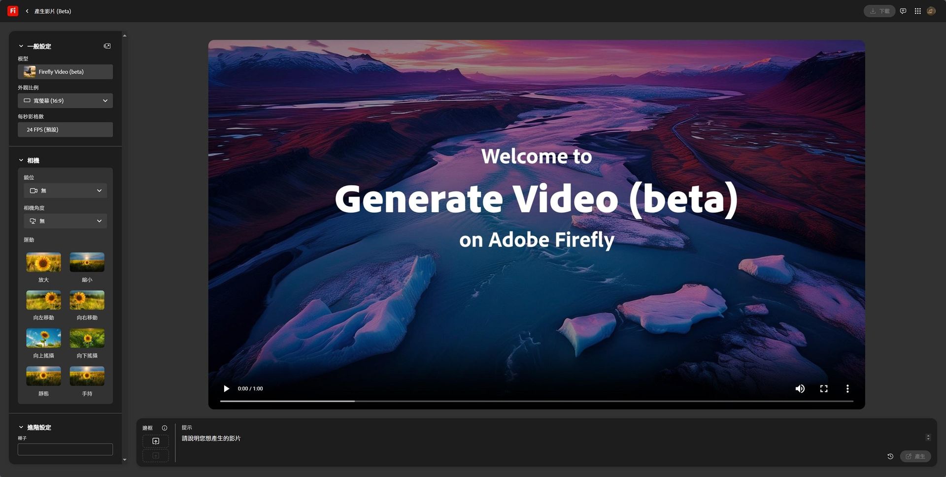 - 解析提示並生成影片:可以直接輸入文字描述或上傳靜態圖像,Firefly 便會輸出約 5 秒長的動態影片(1080p, 24 FPS)。