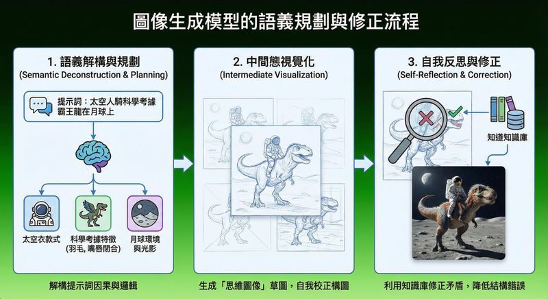 - 語義解構與規劃:模型首先分析提示詞中的因果關係與空間邏輯。例如,面對「一個太空人騎著一隻符合科學考據的霸王龍在月球上」這樣的複雜指令,模型會先規劃:太空人穿什麼太空衣?霸王龍的科學考據特徵是什麼(有羽毛、嘴唇閉合)?月球的光影該如何呈現?