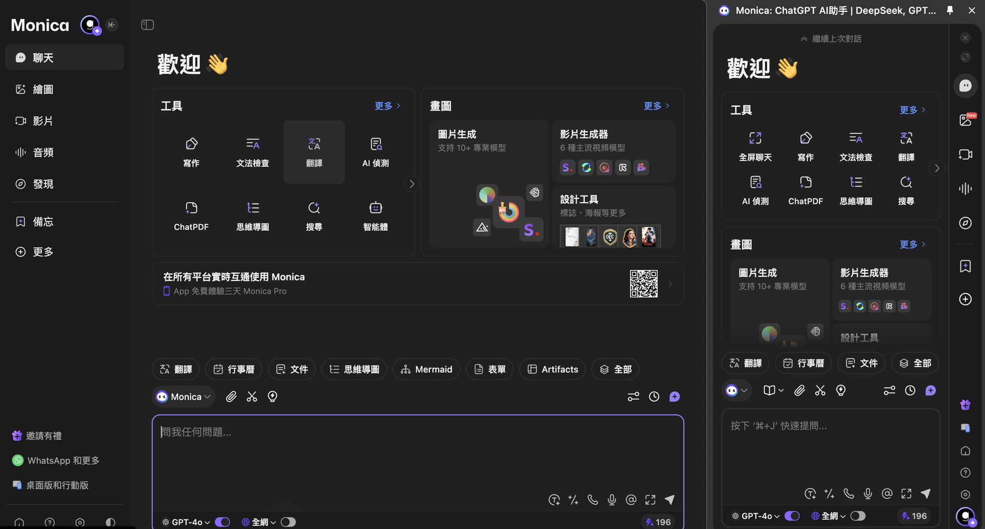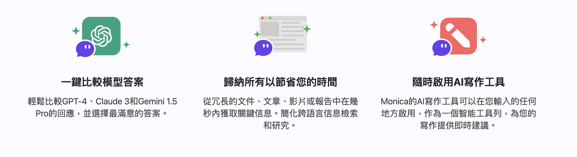 - 除了基本的文字對話,Monica AI 還內建多項工具,如文件摘要、影片解析、AI 寫作助手與圖像生成編輯等,實現跨媒體應用。