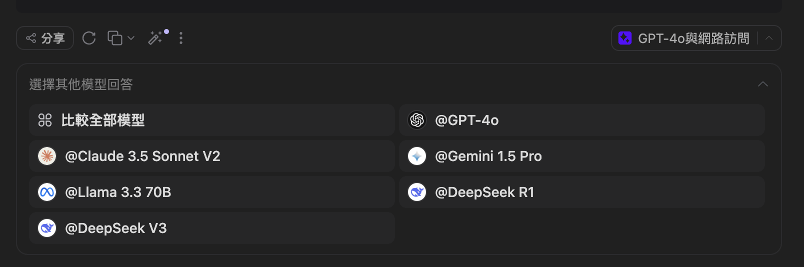 - 內建「一問多答」按鈕,可快速切換不同模型回答。