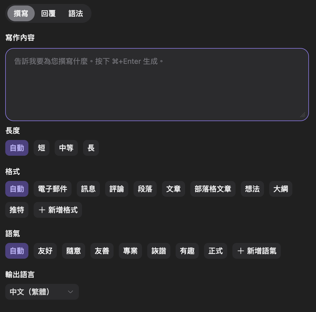 - 輸入文字時,系統即時提供語句優化、用詞建議、內容延伸與結構重組等功能。
