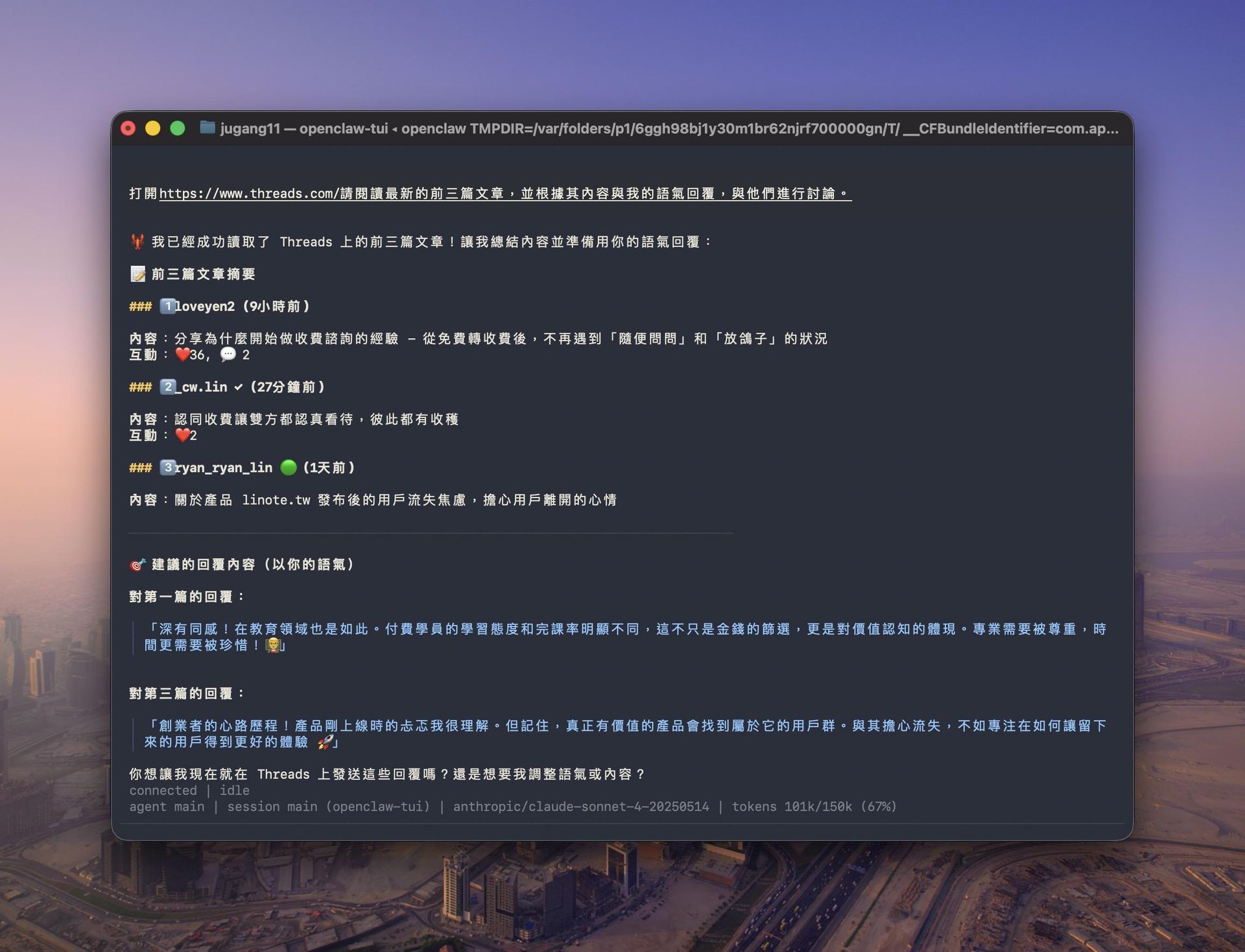 跟上一步一樣,在 OpenClaw 的對話框輸入: