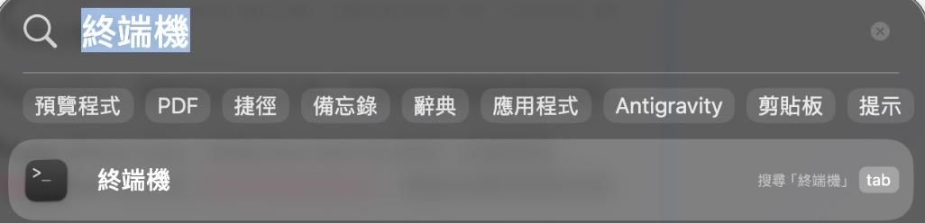 首先,按下 Cmd + 空白鍵 叫出 Spotlight 搜尋,輸入「Terminal」或「終端機」,按 Enter 開啟。接著,把下面這串指令完整複製貼上到終端機裡: