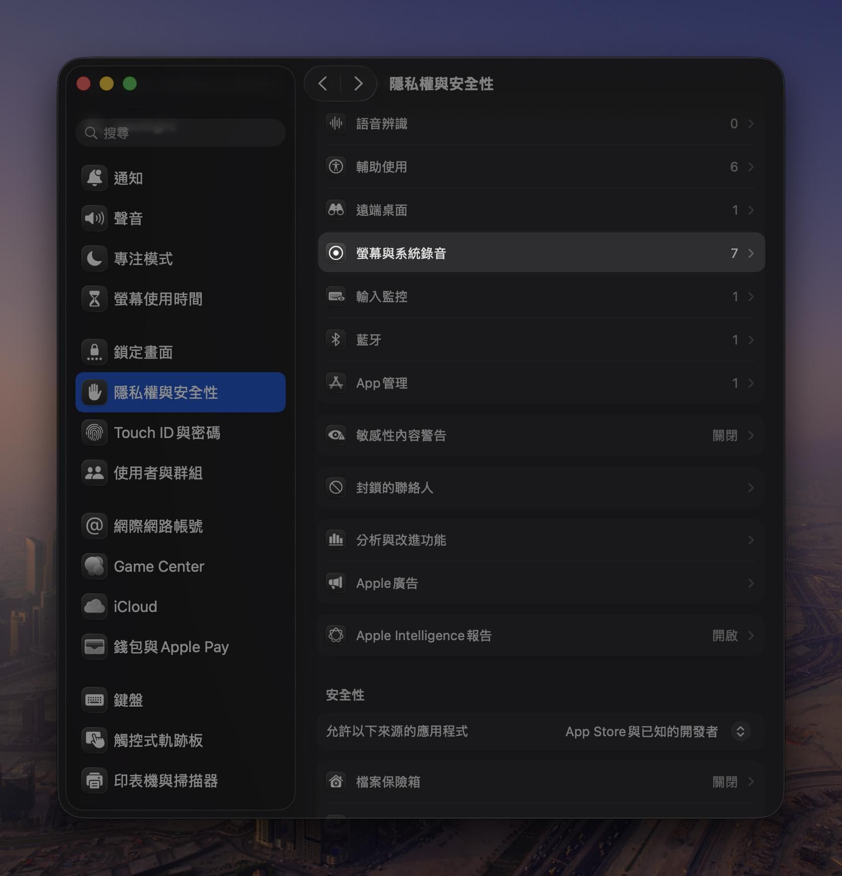 點擊左上角的 Apple 選單,選擇「系統設定」。在左側找到「隱私權與安全性」,點進去之後再找到「螢幕與系統音訊錄製」。進入後你會看到一個程式清單,點擊右側的「+」按鈕來新增程式。