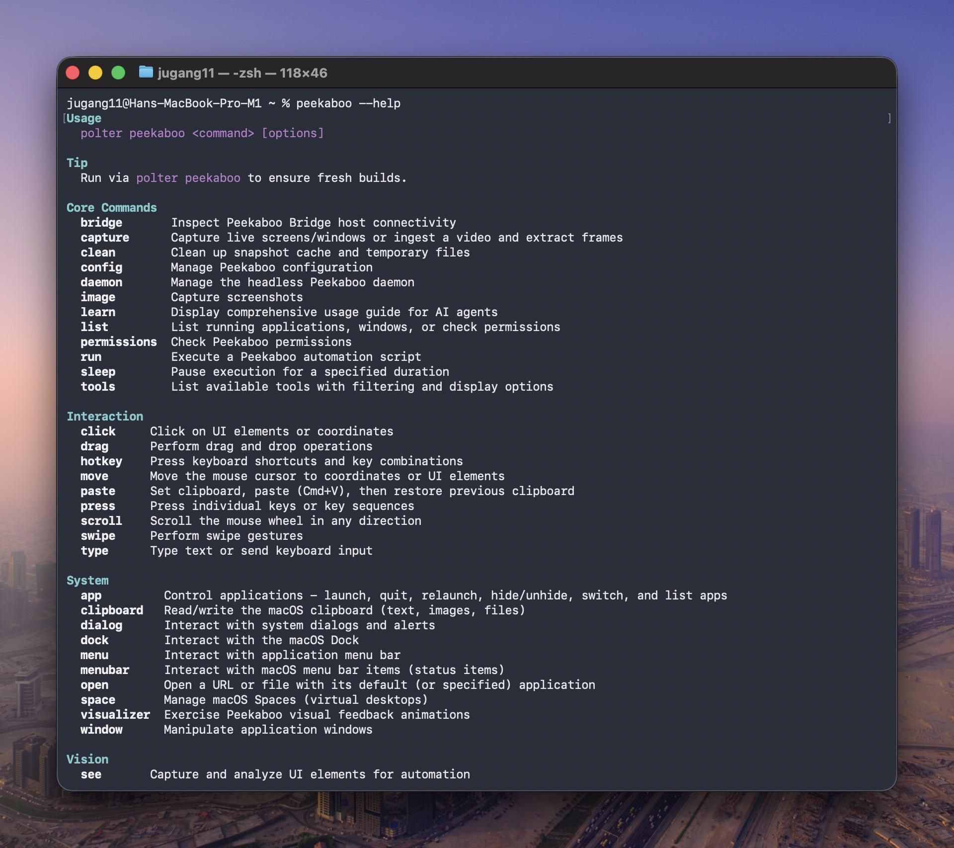 | 查看所有指令 | peekaboo --help | 顯示完整指令清單與使用說明 |