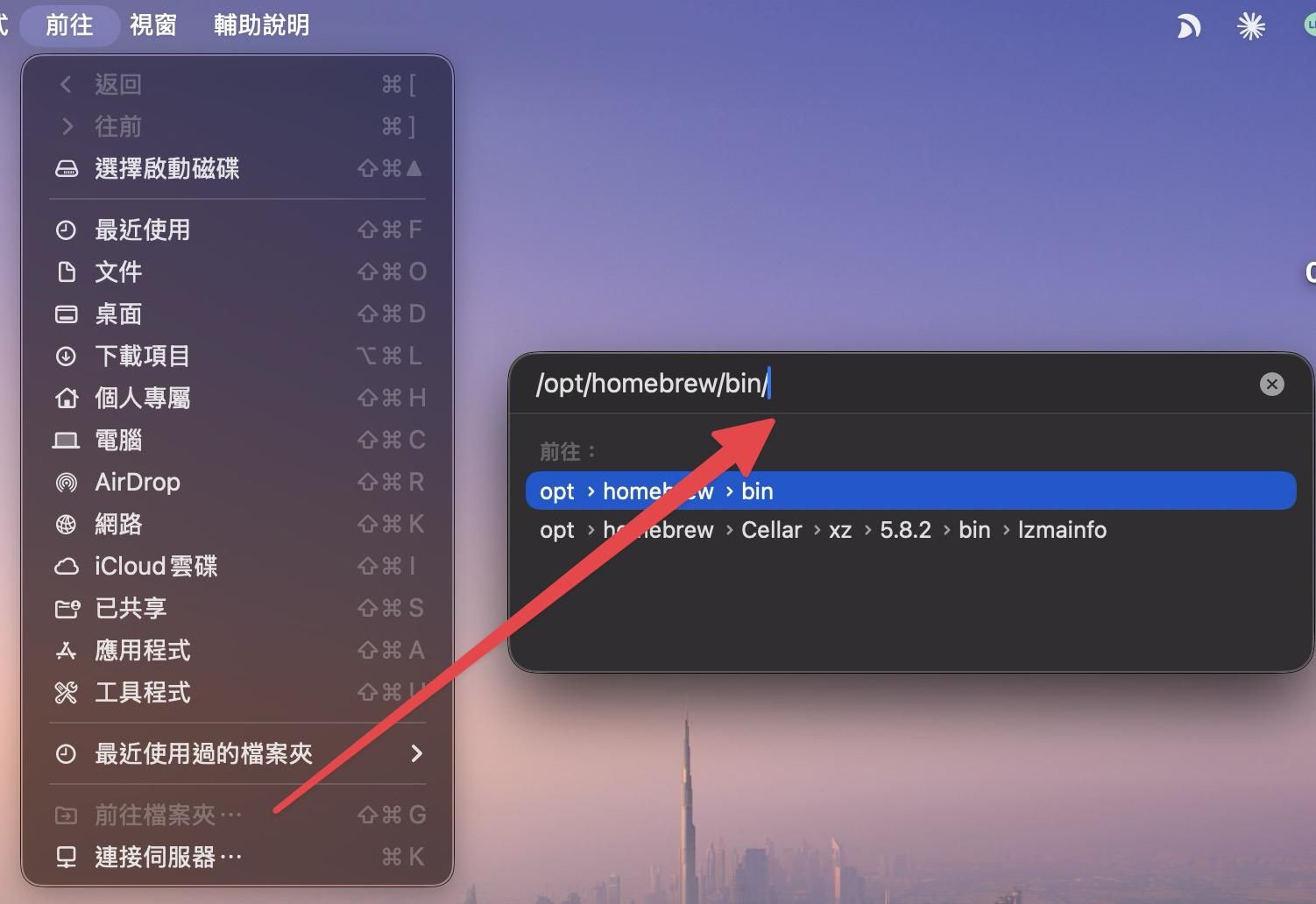 /opt/homebrew/bin按 Enter 就會自動跳到那個資料夾。如果你是 Intel Mac,路徑改為 /usr/local/bin。
