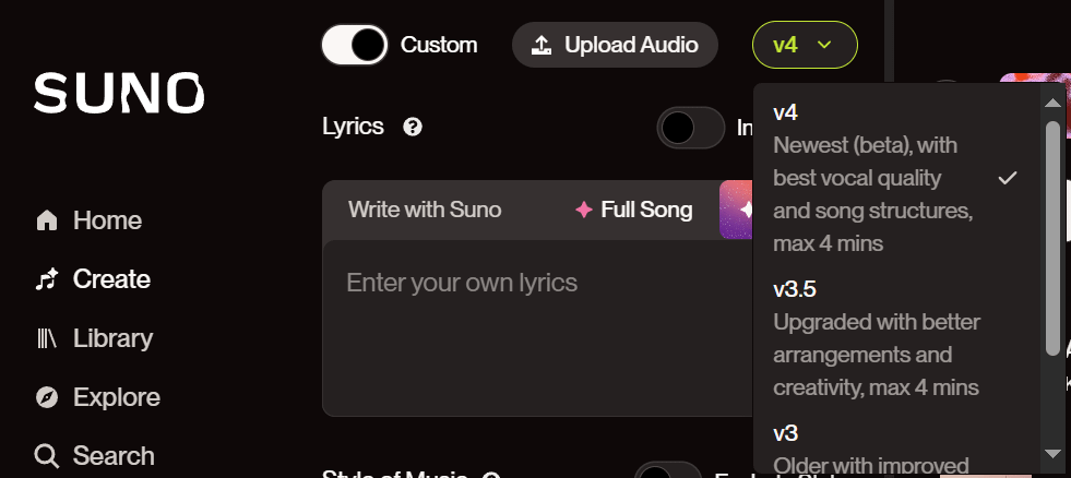 - Suno 最近推出了音頻上傳功能,允許你上傳一段旋律片段作為生成依據。