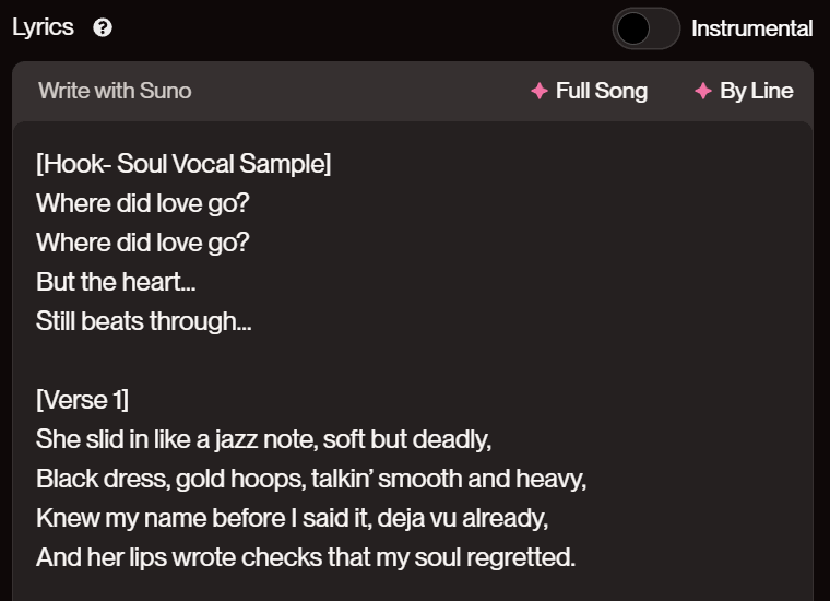- 利用 Suno 支援的結構標記劃分歌詞段落,如 [Verse] 表示主歌、[Chorus] 表示副歌、[Bridge] 表示橋段、[Intro] 表示前奏、[Outro] 表示尾聲等。