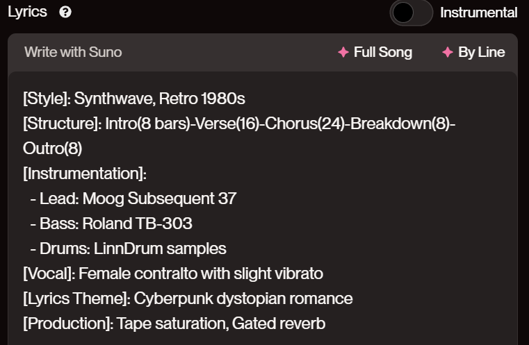 透過清晰的段落標記(如 [Intro]、[Verse]、[Chorus]、[Bridge]、[Outro] 等)與必要的細節補充,可以在生成過程中對歌曲結構進行嚴謹掌控,使整首歌更具層次、起承轉合明確,並保持風格與主題的一致性。