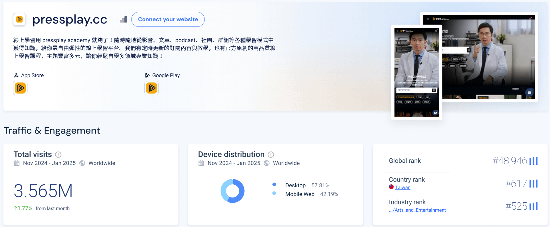 - 直接流量與品牌知名度: Hahow與PressPlay因累積大量用戶,直接輸入網址或透過書籤造訪的比例較高,顯示品牌知名度強。SimilarWeb數據顯示PressPlay網站約57%的桌機流量來自直接來源。Hahow擁有超過110萬會員且用戶黏著度高,也應有相當比例的直接流量。